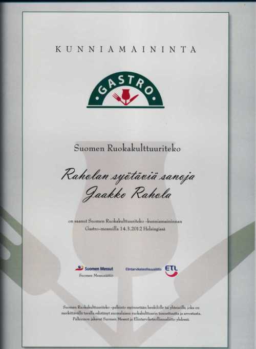Tälle sanastolle luovutettiin Helsingin Gastro-messuilla 14.3.2012 kunniamaininta. “Persoonallisin ja iloisin sanasto, joka ruoasta on koskaan tehty”, raati perusteli päätöstään. Kunniamaininnan myönsivät Suomen Messut ja Elintarviketeollisuusliitto yhdessä. Raadin puheenjohtajana toimi Marleena Tanhuanpää Elintarviketeollisuusliitosta.Kuva sivun alareunassa, napsauta tähän